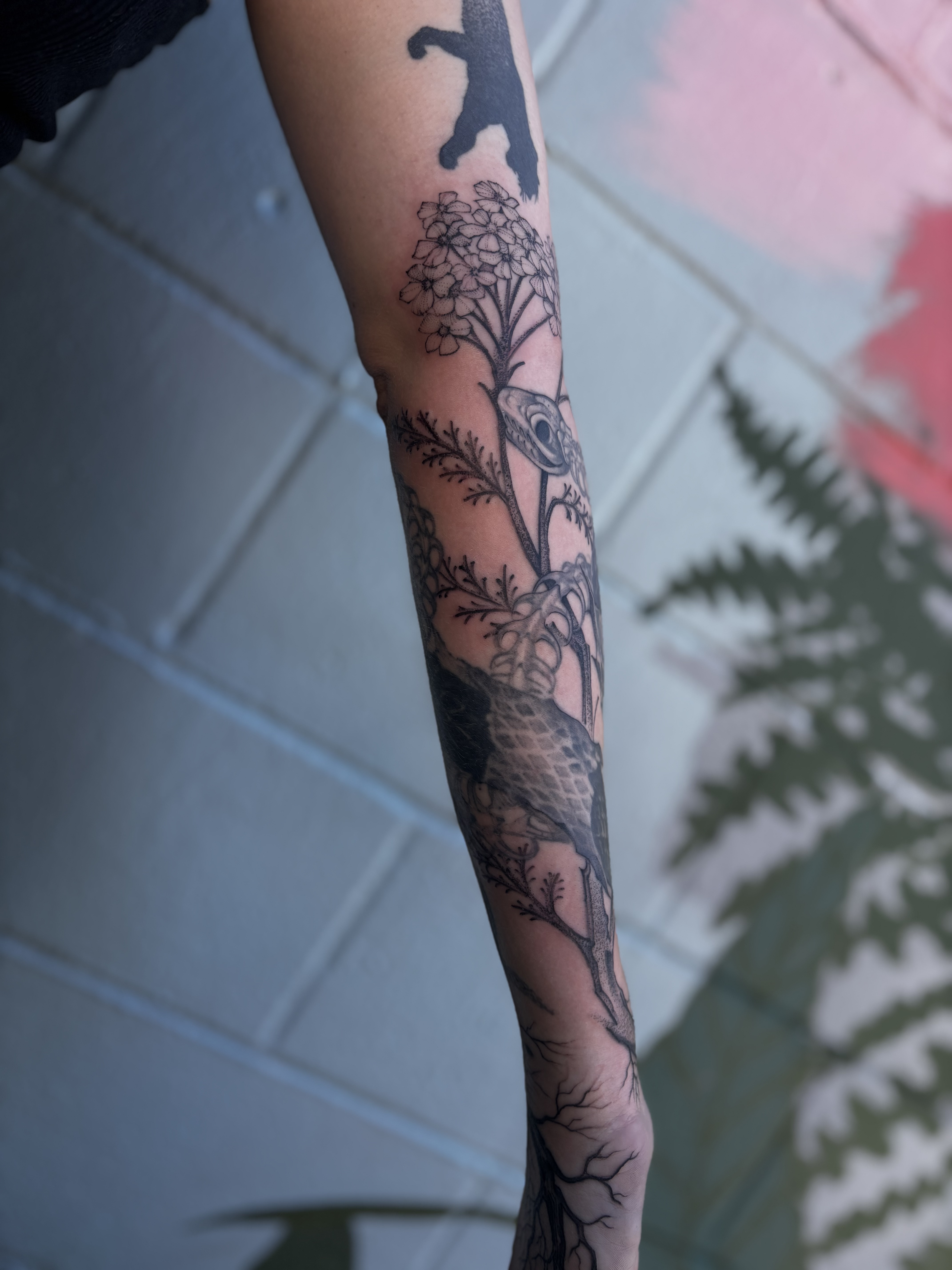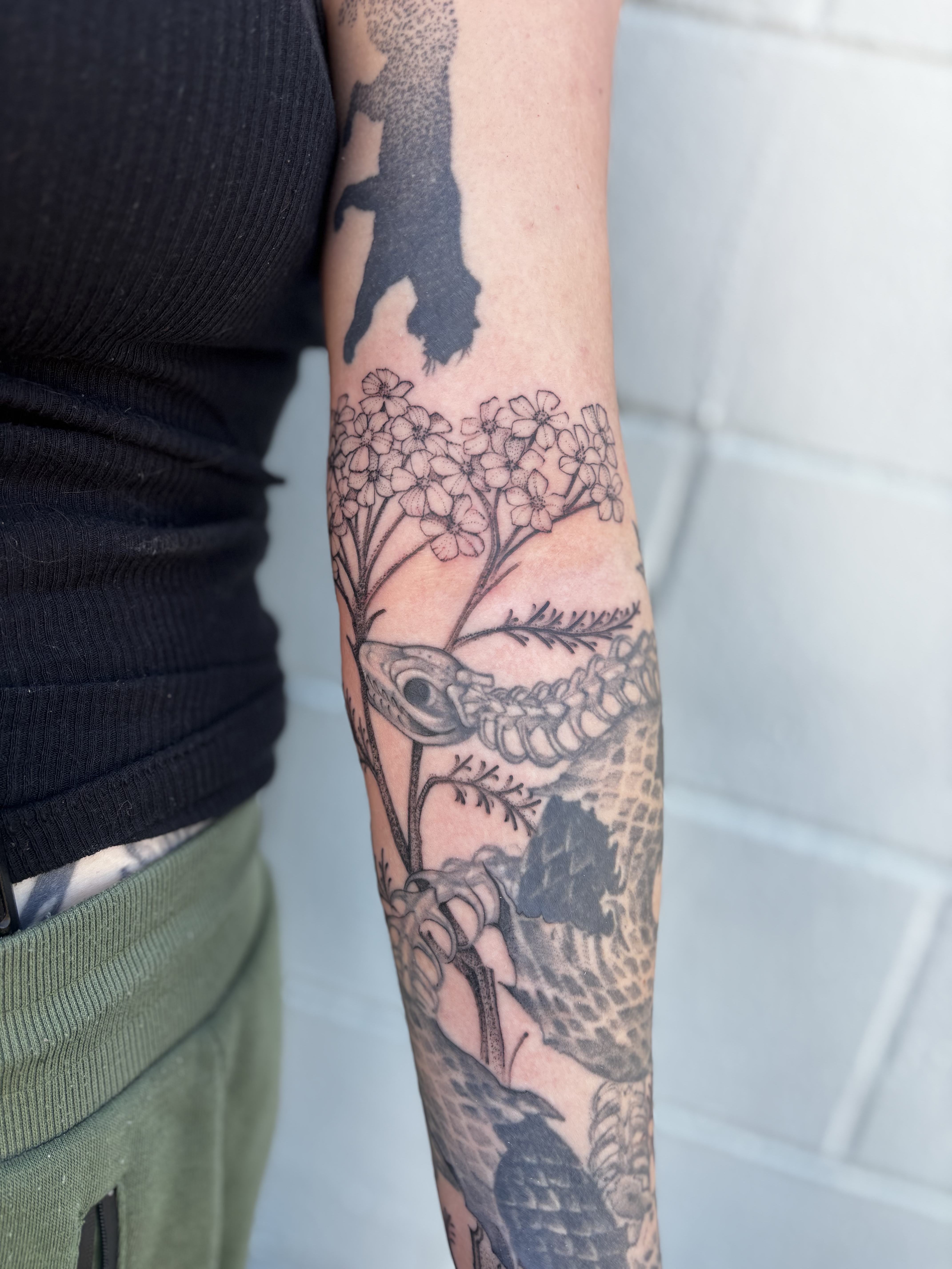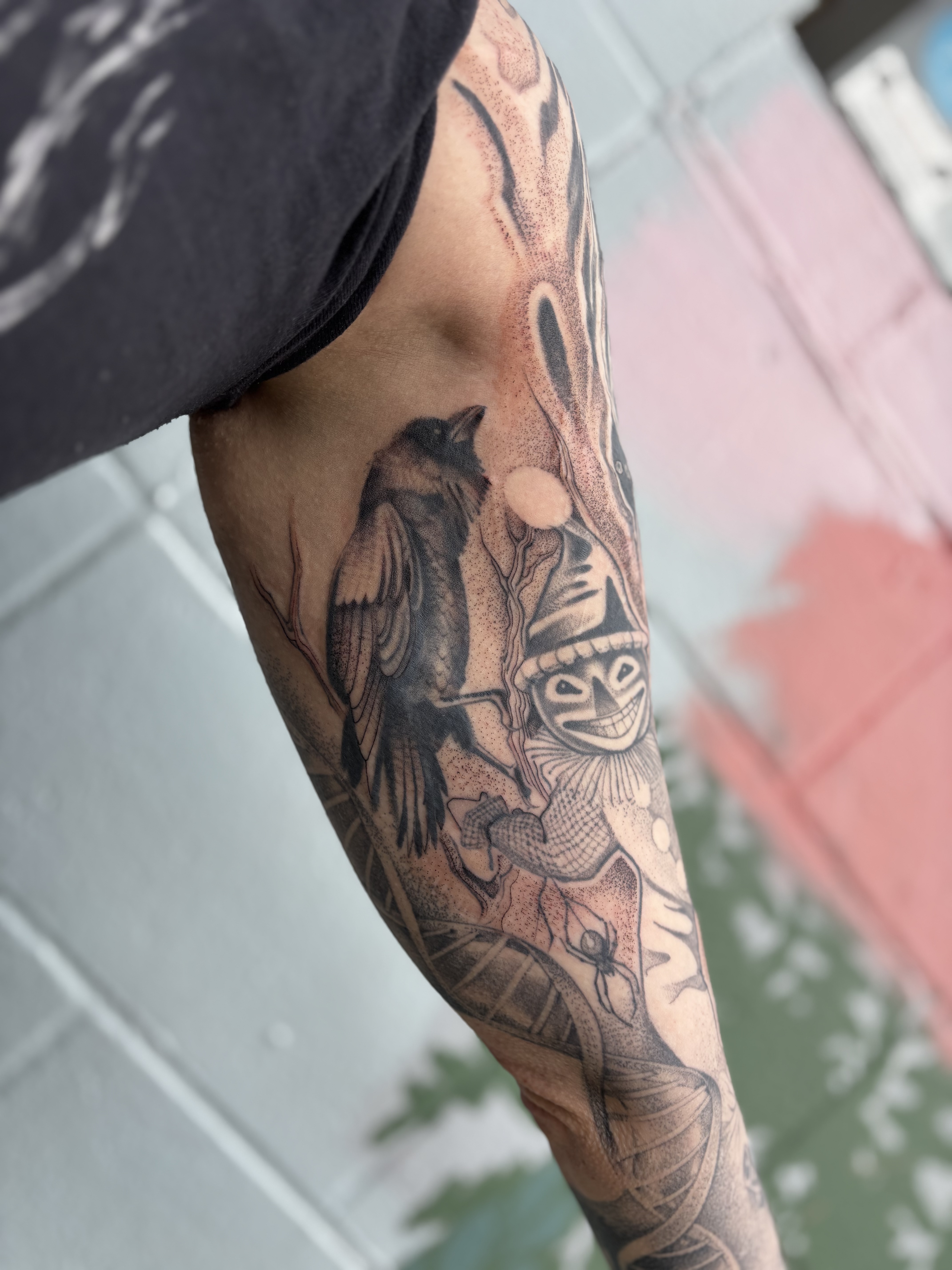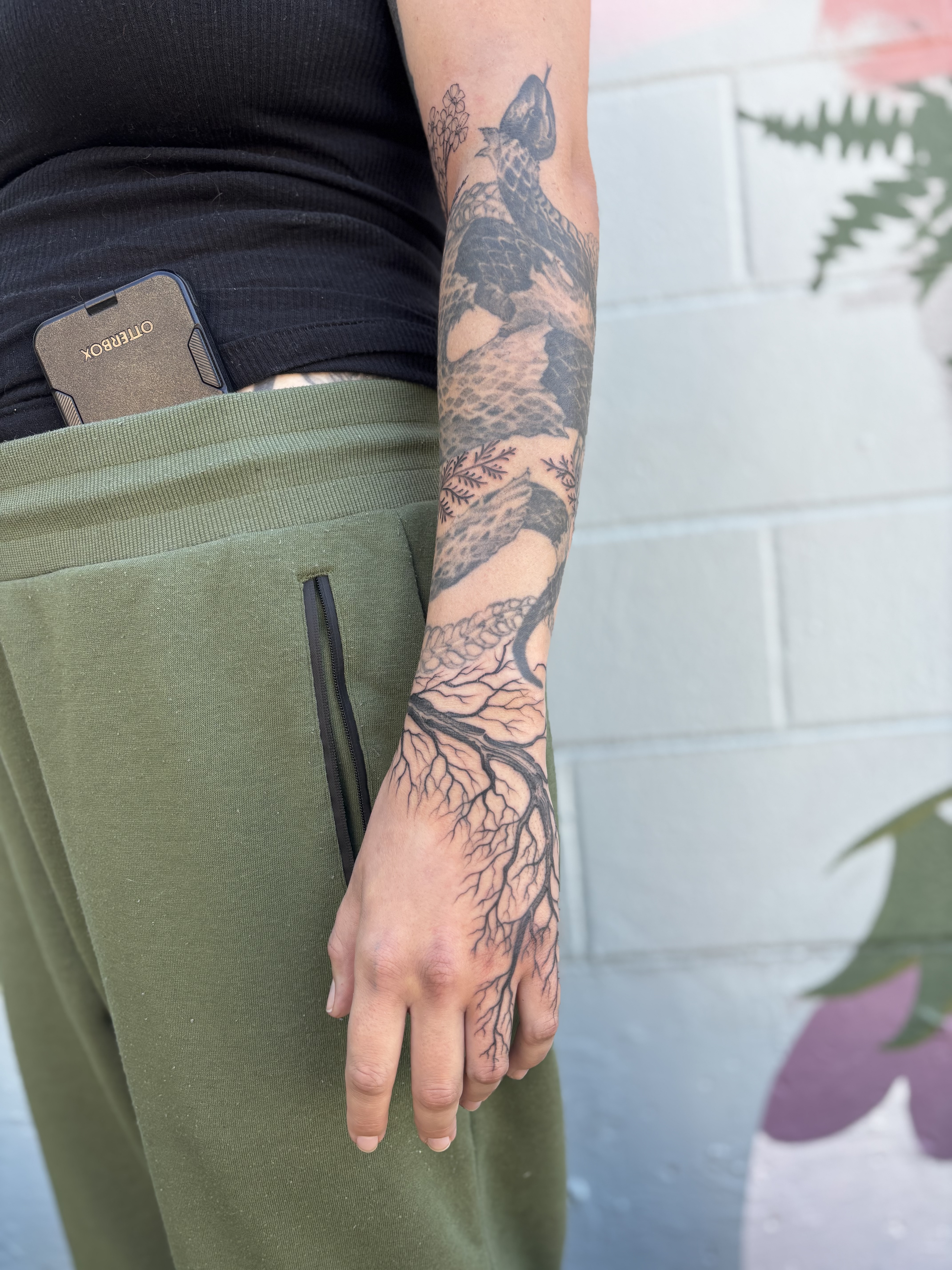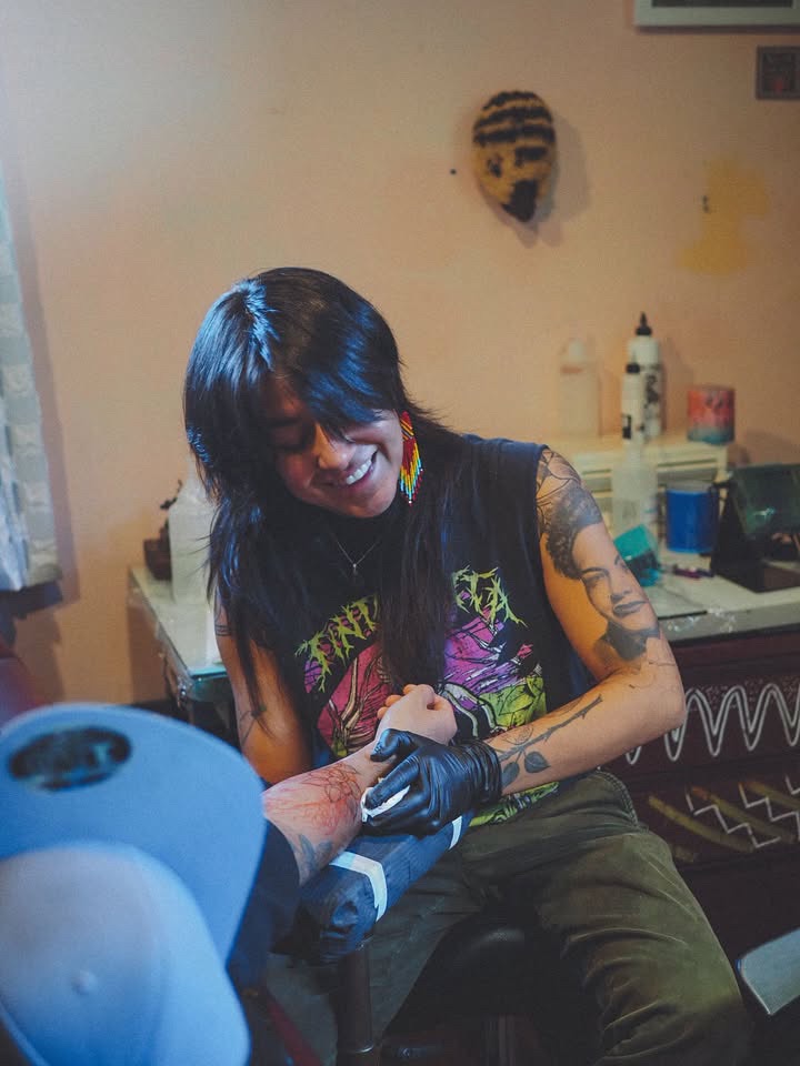 Ana Maldonado aka Ani Mal is determined to take up space and influence growth and cultural development in Kansas City. After years of feeling pushed out of society’s acceptance as a queer person of color resisting mainstream standards, they finally found solace in the tattooing counterculture. Their apprenticeship opened their eyes to the community they always wanted – one full of bleeding hearts and passionate freaks. Upon completion of their apprenticeship, Ani knew they needed to open their own shop to create a safe space for women and queer artists to thrive and grow in their craft. They found that space in a small studio in the West Bottoms and started to build the foundation of Tintoretta Tattoo. The artform of tattooing is important to Ani because of its ability to create beauty from pain, vulnerability through hardness, and connection in a community. They also realize it can easily create a culture of capitalism and toxic masculinity, and because of this they make sure to put their beliefs and values at the forefront of their business. They have always been passionate about drawing and are grateful to have found their calling as a tattoo artist. Their freehand-style animal tattoos are their specialty, but they're always ready to listen to their clients’ needs and deliver something they will truly cherish.