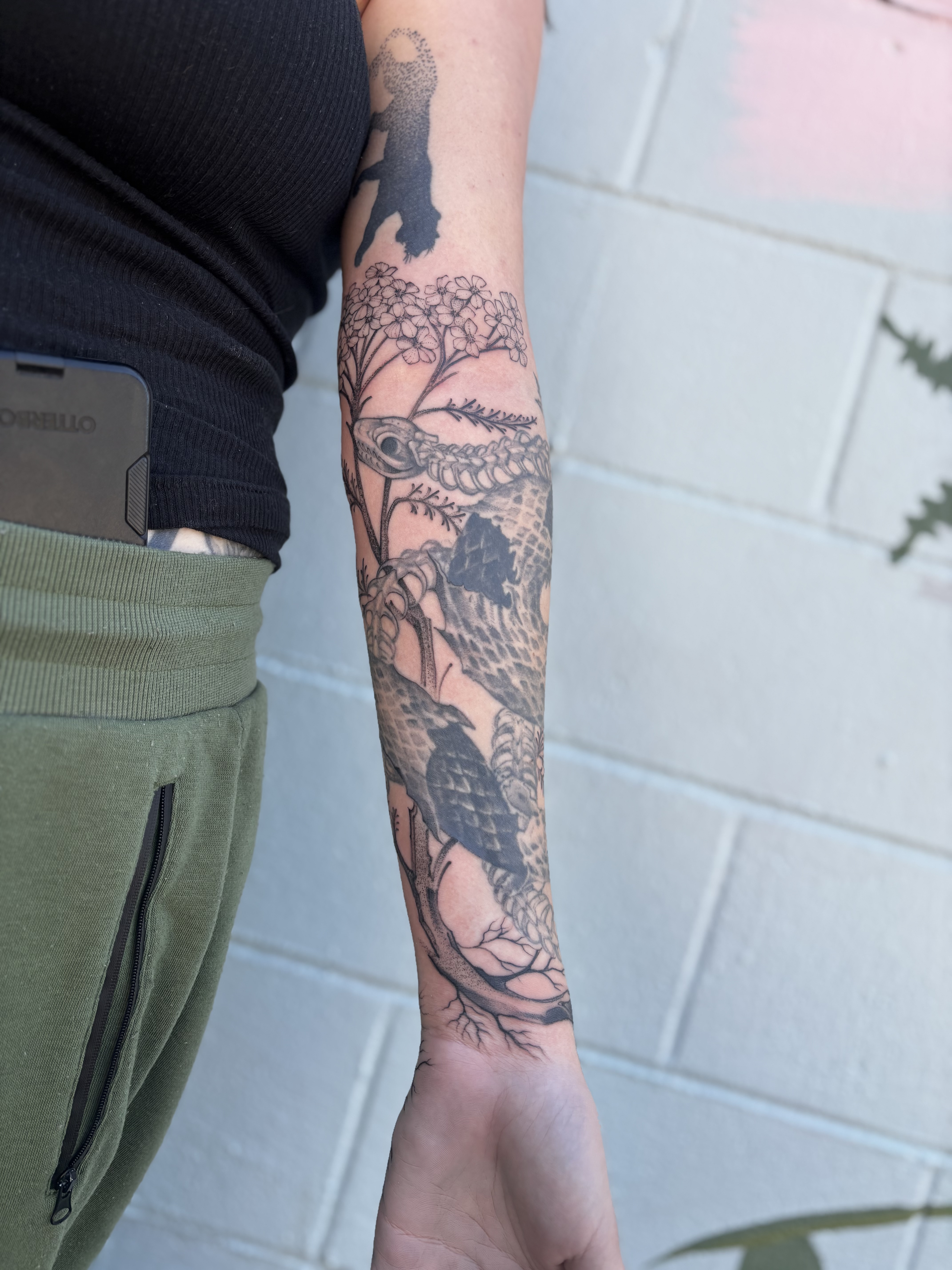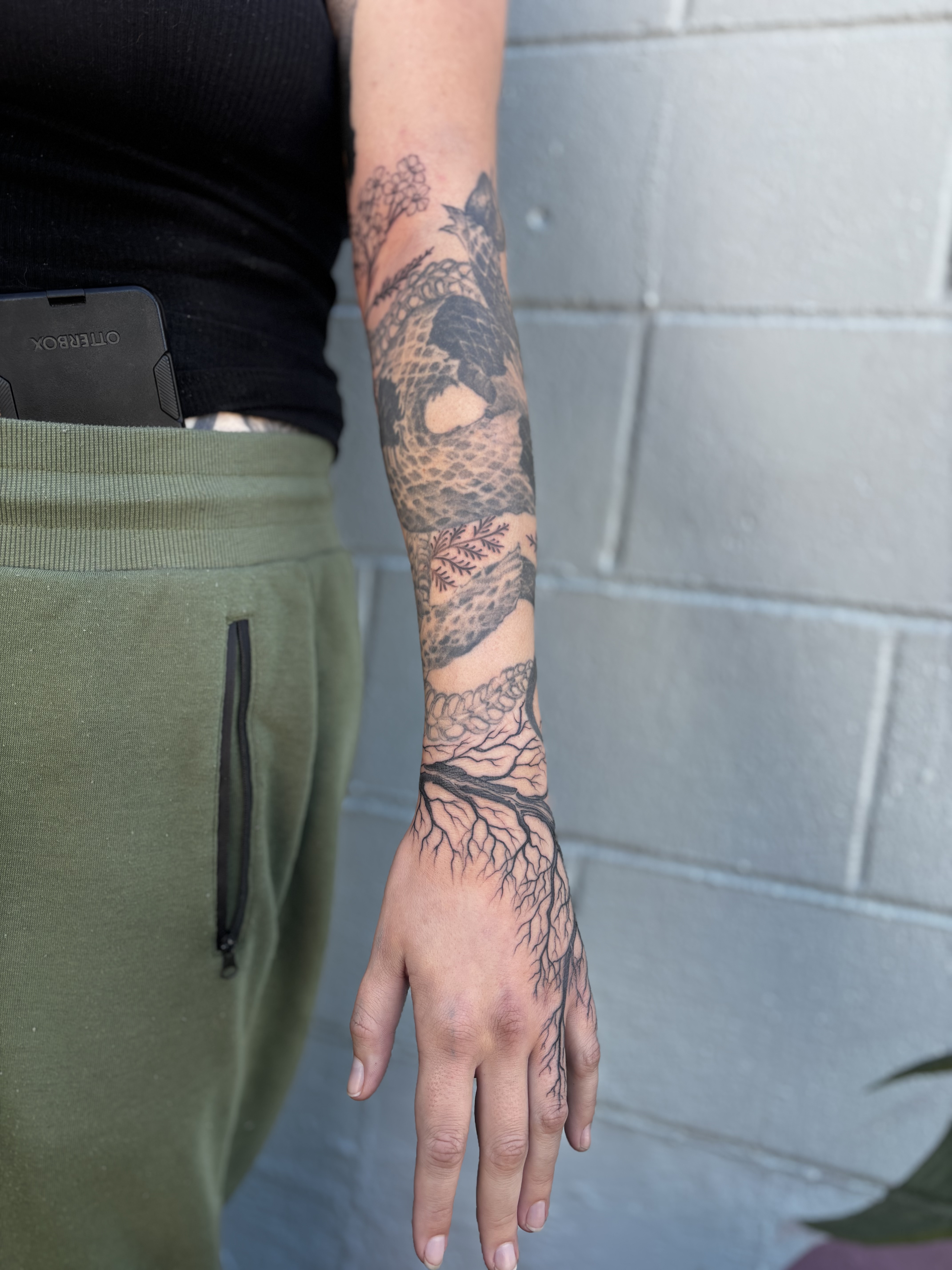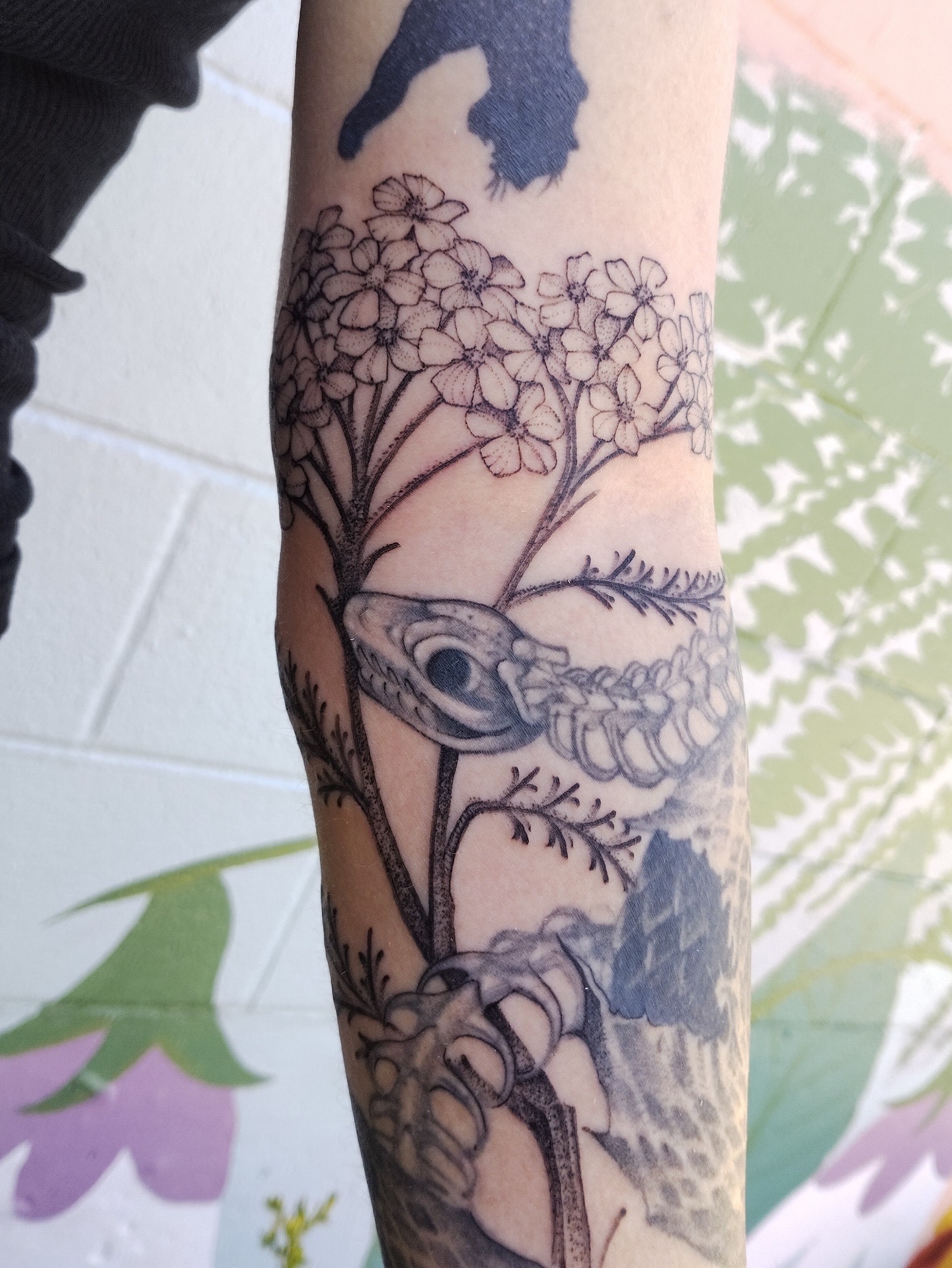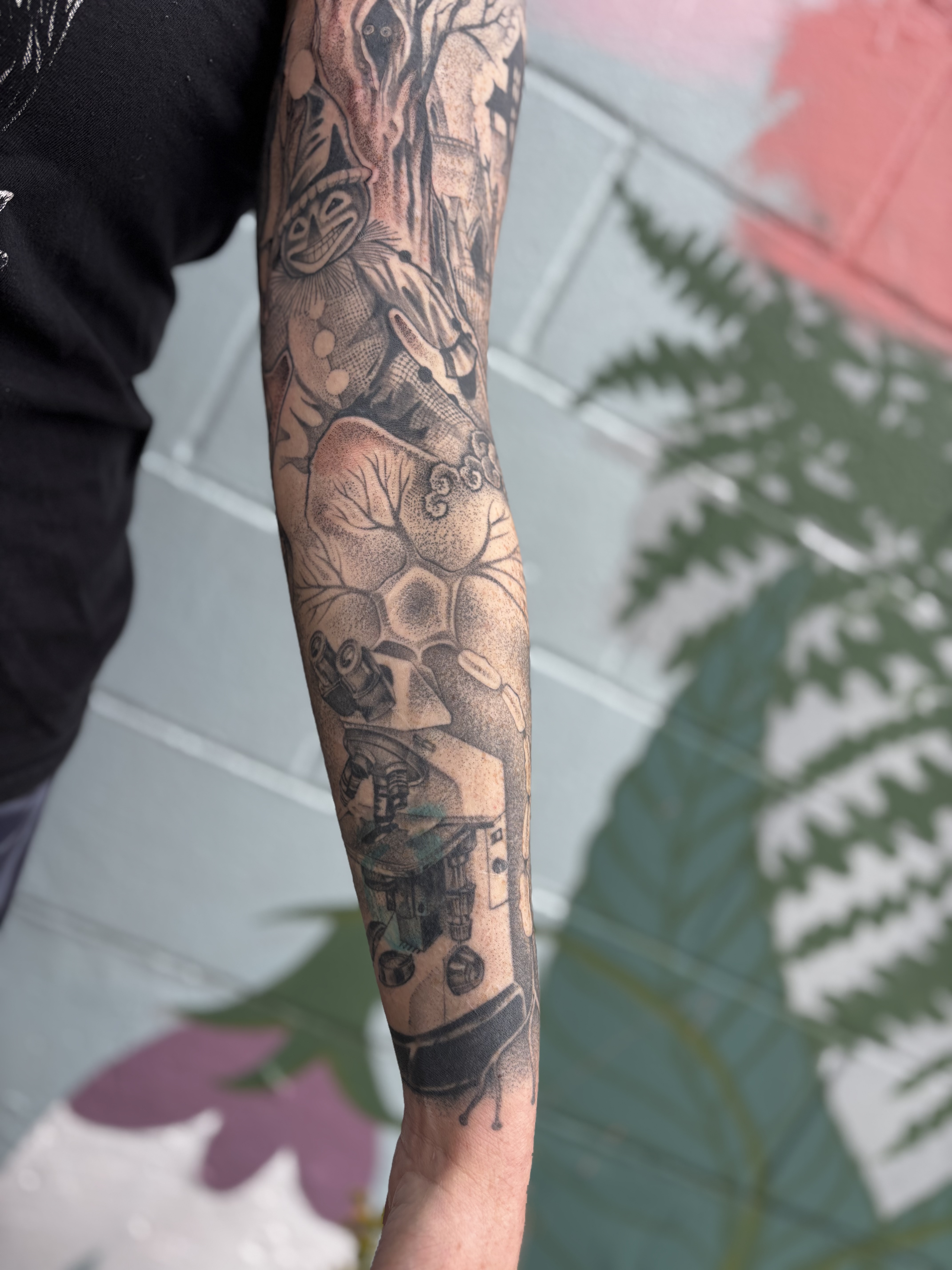 Ana Maldonado aka Ani Mal is determined to take up space and influence growth and cultural development in Kansas City. After years of feeling pushed out of society’s acceptance as a queer person of color resisting mainstream standards, they finally found solace in the tattooing counterculture. Their apprenticeship opened their eyes to the community they always wanted – one full of bleeding hearts and passionate freaks. Upon completion of their apprenticeship, Ani knew they needed to open their own shop to create a safe space for women and queer artists to thrive and grow in their craft. They found that space in a small studio in the West Bottoms and started to build the foundation of Tintoretta Tattoo. The artform of tattooing is important to Ani because of its ability to create beauty from pain, vulnerability through hardness, and connection in a community. They also realize it can easily create a culture of capitalism and toxic masculinity, and because of this they make sure to put their beliefs and values at the forefront of their business. They have always been passionate about drawing and are grateful to have found their calling as a tattoo artist. Their freehand-style animal tattoos are their specialty, but they're always ready to listen to their clients’ needs and deliver something they will truly cherish.